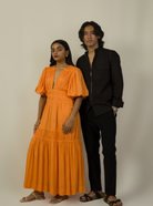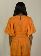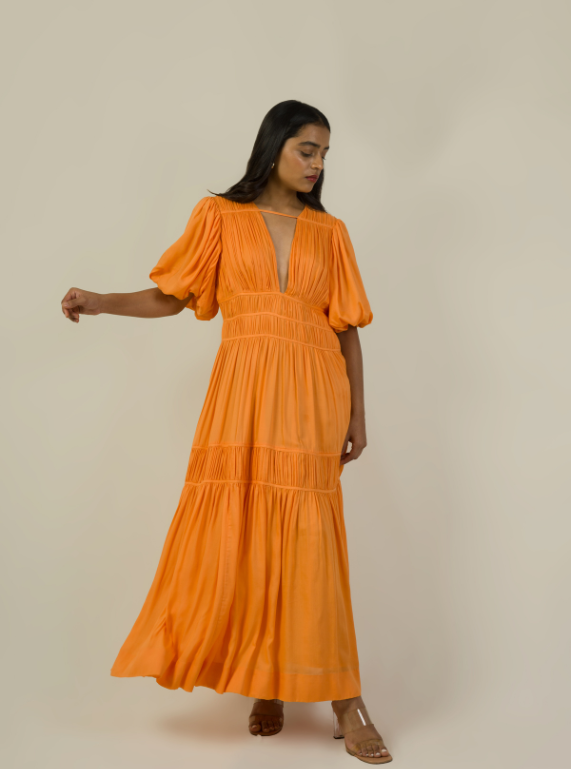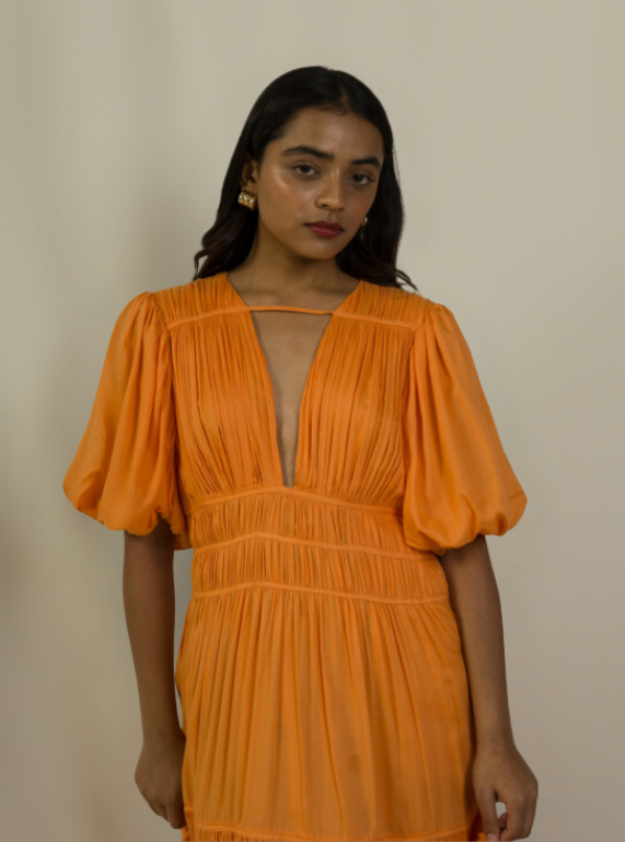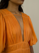 Dress like a dream. Here's the event-ready midi that sets its own standard. Handcrafted in a refreshingly captivating apricot crush hue, the Plunge Neckline Dress is a Must Have in your wardrobe.