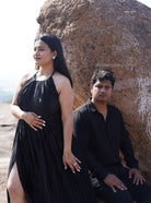 Faites une déclaration dans cette superbe robe accordéon à fente haute, dotée d'un col licou avec un design tressé et plissé sur le tissu pour créer un look saisissant et dramatique. Parfait pour se démarquer lors de tout événement spécial.