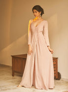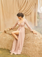 La pièce parfaite à porter lors d'un événement formel ou d'une soirée cocktail, cette robe à col plongeant en blush est fabriquée à la main à partir de tissu à peau d'orange et ornée de Glass Cut Dana